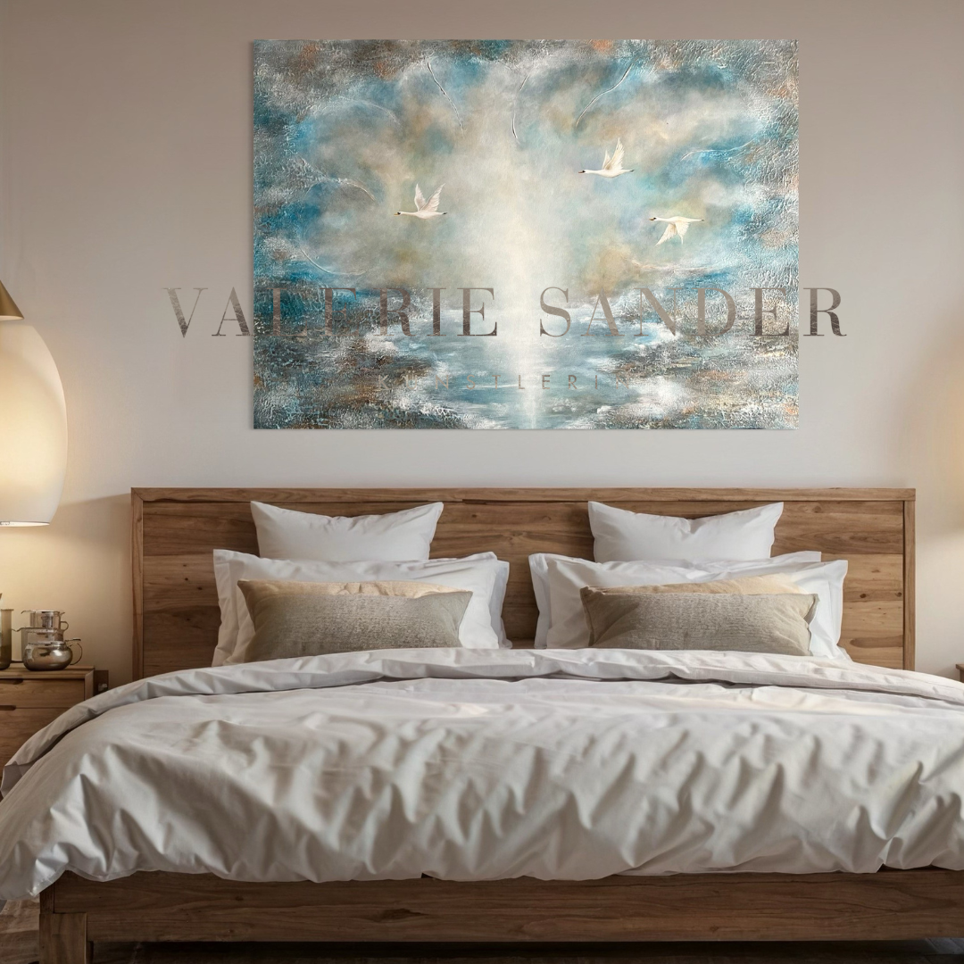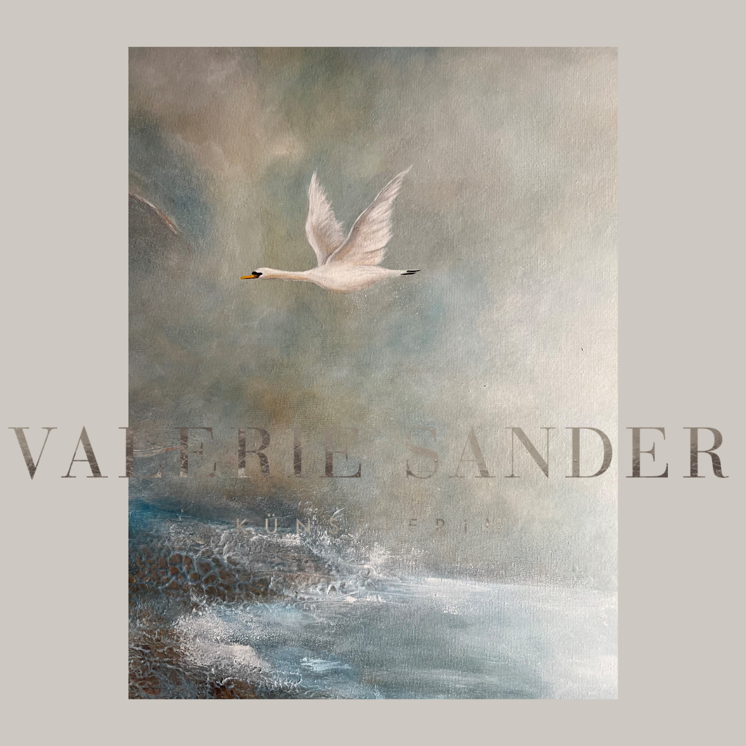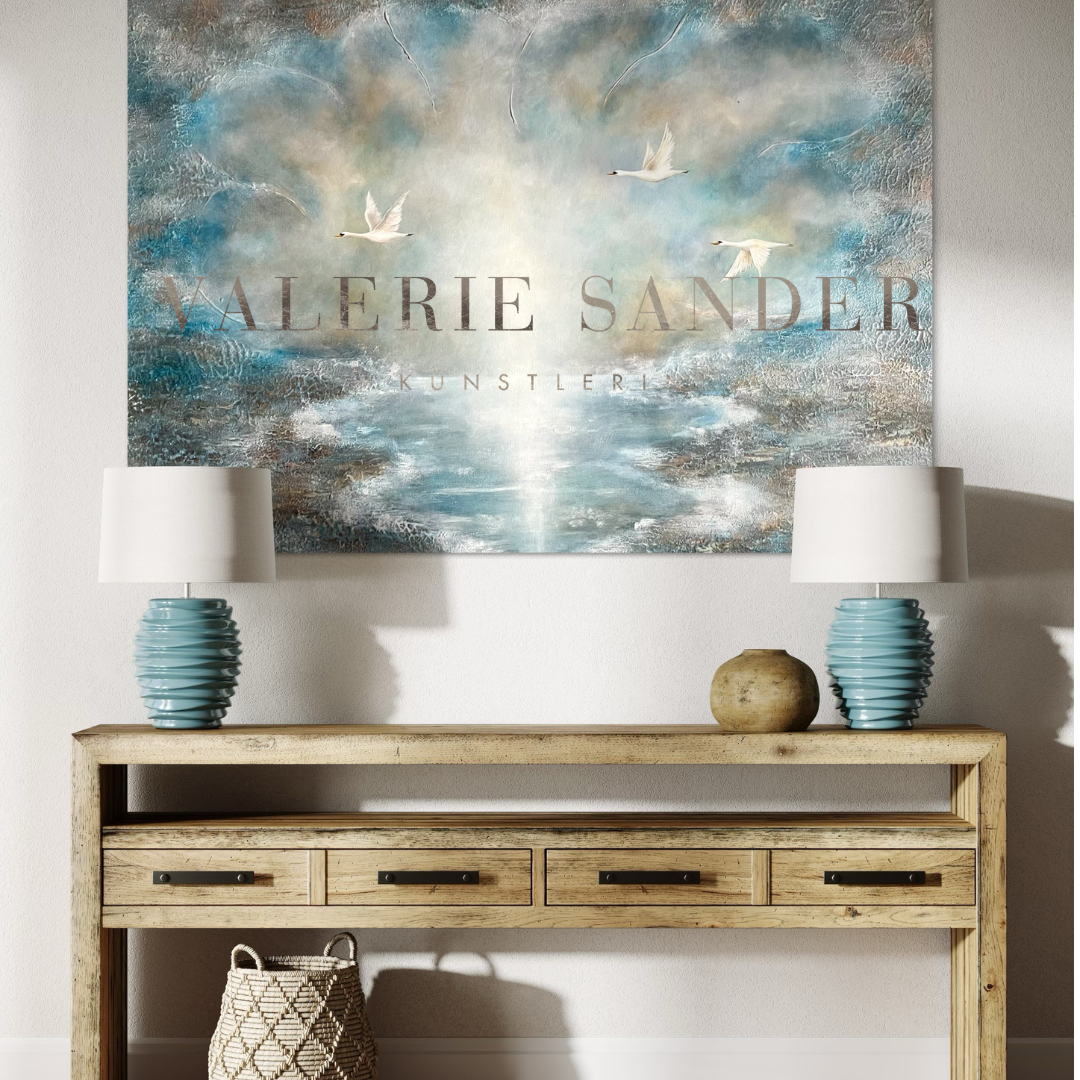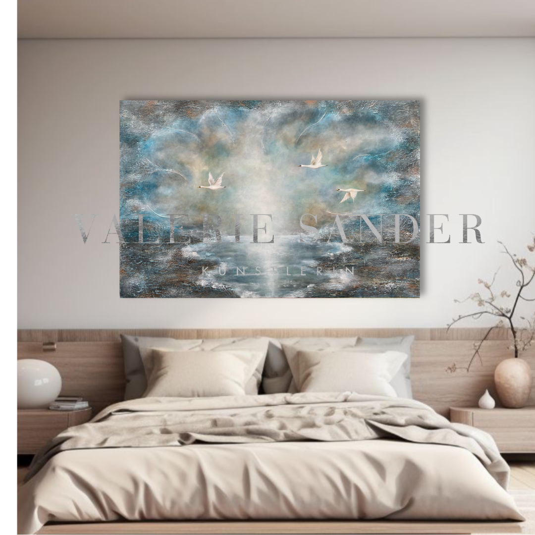 Die Schwanenreise ist ein sehr stimmungsvolles und beruhigendes Gemälde. Der Betrachter kann tief in dieses Bild hineinschauen, es vermittelt Freiheit, Ruhe, Entspannung. Ein wunderschönes Gemälde in frischen Blau- und Grautönen. Ideal für helle Räume.